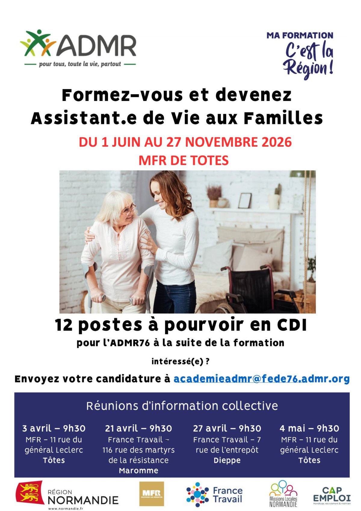 - L’Assistant De Vie aux Familles relaie les familles auprès de personnes fragilisées ou dépendantes de façon régulière ou ponctuelle.